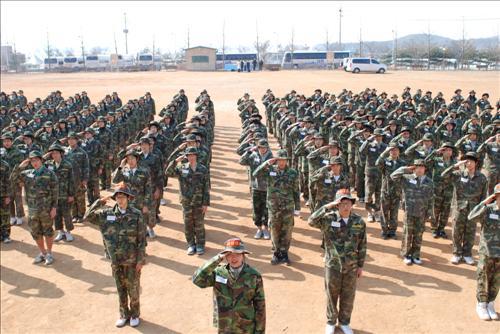 ▲ 학교 수련회로 해병대 캠프에 입소한 중학생들이 입소식에 거수경례를 하고 있다. (제공=해병대 전략캠프) |