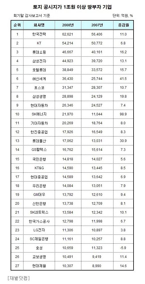 재벌 닷컴에 따르면 1조원이 넘는 토지를 보유한 '땅부자' 기업은 모두 27개사인 것으로 조사됐다. '기업별 업무용 토지 공시지가 현황'을 조사한 결과 지난해 말 기준으로 1조원이 넘는 토지를 보유한 기업은 전년보다 2곳이 증가한 27개사였다.