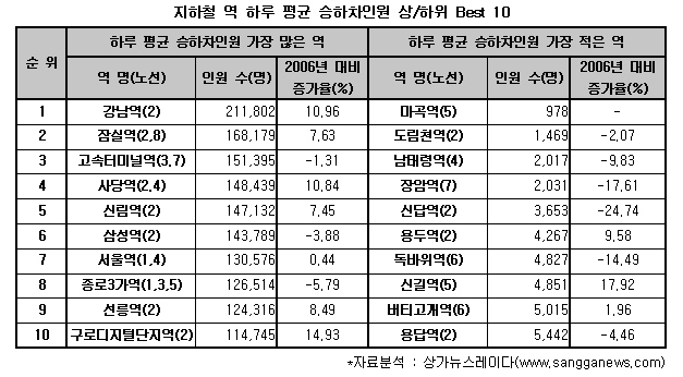 상가투자자문업체인 상가뉴스레이다(www.sangganews.com)는 서울메트로(1~4호선)와 서울도시철도(5~8호선)의 자료를 토대로 서울시 231개 지하철역의 2009년 1월~ 4월까지의 하루 평균 승하차 인원을 조사한 결과 하루 평균 승하차인원이 가장 많은 10개 역은 ▲강남역(2호선) 211,802명, ▲잠실역(2,8호선) 168,179명, ▲고속터미널역(3,7호선) 151,395명, ▲사당역(2,4호선) 148,439명, ▲신림역(1,2호선) 147,132명, ▲삼성역(2호선) 143,789명, ▲서울역(1,4호선) 130,576명, ▲종로3가역(1,3,5호선) 126,514명, ▲선릉역(2호선) 124,316명, ▲구로디지털단지역(2호선) 114,745명 순으로 나타났다.