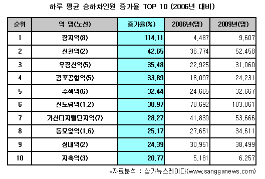 또한 2006년 대비 하루 평균 승하차 인원 증가율은 ▲장지역(8호선, 114.11%), ▲신천역(2호선, 42.65%), ▲우장산역(5호선, 35.48%), ▲김포공항역(5호선, 33.89%), ▲수색역(6호선, 32.44%), ▲신도림역(1,2호선, 30.97%), ▲가산디지털단지역(7호선, 28.27%), ▲동묘앞역(1,6호선, 25.17%), ▲성내역(2호선, 24.39%), ▲지축역(3호선, 20.77%) 순으로 조사되었으며, 기존 도심권의 ▲강남역(10.96%), ▲사당역(10.84%), ▲서울대입구역(10.63%), ▲홍대입구역(13.46%), ▲구로디지털단지역(14.93%) 등도 상대적으로 높은 증가율을 보였다.