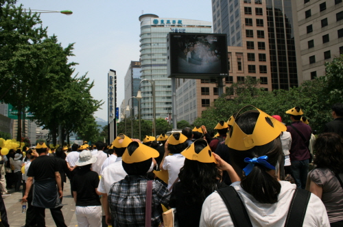 [프라임경제] 29일 故노무현 전 대통령의 영결식이 진행되는 동안 대형스크린을 통해 시민들이 생전 노무현 대토령의 영상을 보고 있다.