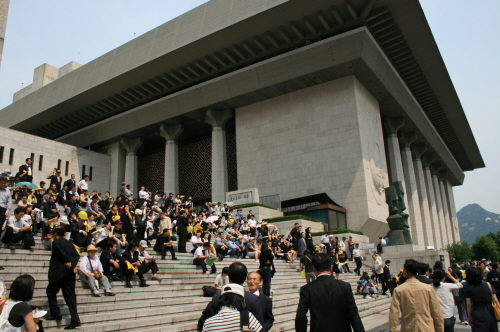 [프라임경제] 29일 오전 故 노무현 전 대통령의 영결식이 경복궁에서 열린 가운데 노 전 대통령을 추모하고 고인의 영혼을 위로하기 위해 세종문화회관에 모여있는 시민들.