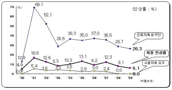 근로자측은 최소 12.8%(2000년), 최대 69.1%(2001년)의 평균 36.1%의 인상안을 제시했다. 사용자측은 최소 0%(2000년, 2008년~2009년), 최대 5.4%(2001년)의 평균 2.5%의 인상안을 제시했다.