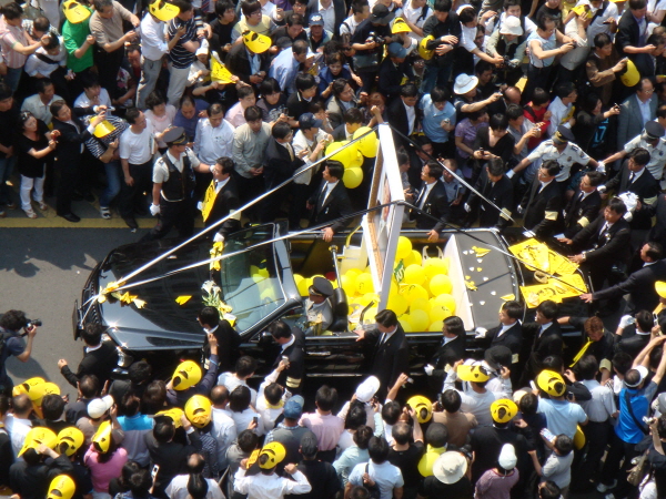 | < 사진 = 노무현 전 대통령의 영정사진이 지나가고 그 뒤를 운구 차량이 따르고 있다 > | ||