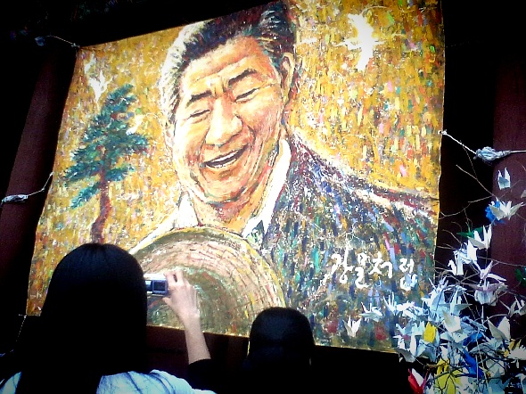 [프라임경제] 시민분향소가 설치된 대한문 앞에 걸린 노무현 전 대통령의 모습을 담기 위한 한 시민의 모습.