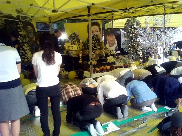 | <서울 광장 앞 '노제'를 마친 후 운구차량이 화장터로 향한 그 시각에도 분향소를 찾는 조문행렬이 계속되고 있다. /대한문 앞 시민 분향소 모습.> | ||