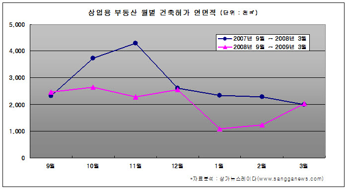상가투자정보 제공 업체인 상가뉴스레이다(www.sangganews.com)의 분석에 따르면 2009년 3월 상업용 건축물 건축 허가 연면적은 2,025548㎡으로 작년 동월의 1,986,716㎡에 비해 소폭 증가했다.