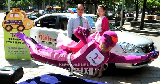 한국스마트카드는 1일, 광화문 세종로사거리와 강남역 등 서울의 주요 도심 5곳에서 3천원 이하 택시요금을 무료로 결제해주는 ‘터치맨을 찾아라’ 이벤트를 개최했다. ‘터치맨을 찾아라’ 이벤트는 서울과 인천의 주요 도심에서 터치맨이 택시 승객들을 대상으로 요금을 무료로 결제해 주는 이벤트다. 6월 19일까지는 서울 6월 18일과 19일에는 인천에서 행사가 진행된다. 이벤트 지역에서 승객이 택시에서 내릴 때 보라색 캐릭터 복장을 착용한 터치맨을 발견하면 택시 요금이 3천원 이하 소액요금일 경우 T-money로 요금을 대신 결제해준다.