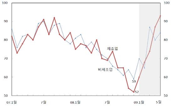 제조업 자금사정BSI는 5개월 연속 상승한 것으로 2006년 3월 이후 가장 높은 수준을 기록했다.