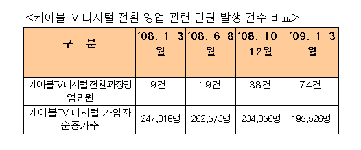 방송통신위원회에 접수된 민원집계에 따르면, 금년초(1~3월) 케이블TV의 디지털 전환영업 관련 불만이 총 74건으로 지난해 말부터 점차 증가하고 있는 것으로 나타나고 있다.