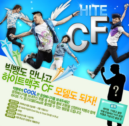 하이트맥주(대표: 김지현)는 아이돌스타 빅뱅과 함께 2009년 하이트맥주 두번째 CF의 모델로 활약할 소비자 20명을 선발한다. 선발된 20명의 소비자 모델은 6월 중순 빅뱅과 함께 CF를 촬영할 예정이다. 선발된 소비자모델은 11일 홈페이지를 통해 선발 여부를 확인할 수 있으며, 촬영 일정과 장소는 개별 연락을 통해 알려준다.