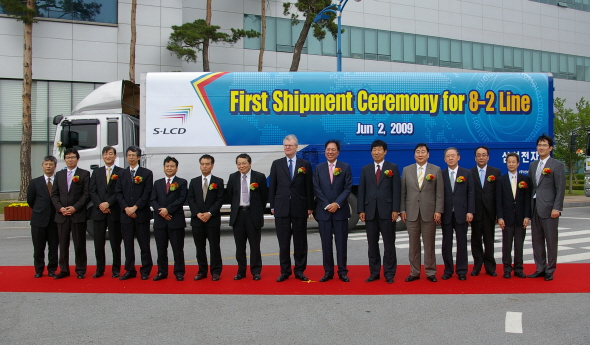 | <2일 삼성전자 탕정사업장에서 개최된 S-LCD 두번째 8세대 라인 양산 출하식에서 참석자들이 첫 출하를 축하하기 위해 기념 촬영을 하고 있다.> | ||