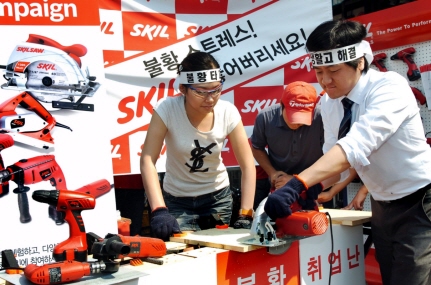 이번 행사는 소비자 대상으로 스킬(SKIL) 제품을 체험하게 하고 고객 만족을 극대화하는 행사로, ‘불황’ ‘취업난’ ‘생활고’ 등을 의미하는 송판을 스킬의 충전드릴(모델명 2250), 원형톱(모델명 5300), 대패(모델명 1560) 등의 전동공구로 뚫거나 자르면서 불황의 스트레스를 이기자는 취지로 기획됐다. 또한, 행사 참가자들을 대상으로 ‘스킬로 경기 확 풀릴 라면’ ‘스킬로 스트레스 뻥 날릴 라면’ 등의 경품도 함께 증정했다.