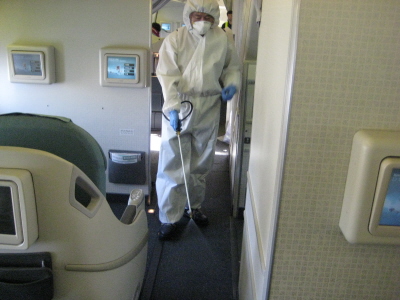 항공업계에서는 혹시 모를 신종 플루 환자 탑승을 대비해 비행 후 철저하게 기내 방역을 실시하고 있다. 대한항공은 지난 2003년 사스가 유행하던 시기에 기내방역용으로 사용하던 살균소독제인 에코트루에 비해 한 단계 진화된 인바이로트루(EnviroTru)라는 특별 소독제와 OGEE-350, 특별 소독제(바이오 크린액트)를 함께 사용하여 신종 플루 발현지역을 여행하는 항공기들을 매 비행시마다 소독함으로써 기내 위생 및 안전확보에 만전을 기하고 있다.