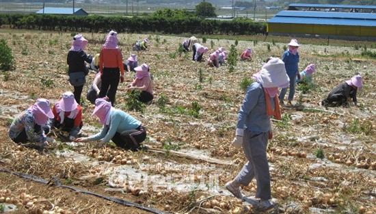 | ▲(사)고향을 생각하는 주부들의 모임 회원들이 대덕 양파농원에서 양파 주워 담기 작업을 실시하고 있다. |