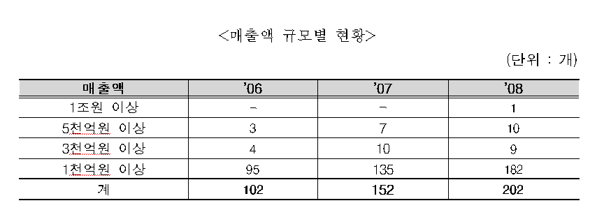 실제로 매출 천억 벤처기업은 2004년 68개, 2005년 78개, 2006년 102개, 2007년 152개, 2008년에는 202개로 연평균 31%씩 증가했다. 특히, 202개 기업의 평균 매출증가율은 25.5%로 12월 결산 유가증권시장 평균 매출증가율 23.7%, 코스닥시장 평균 매출증가율 18.4%를 상회한다.