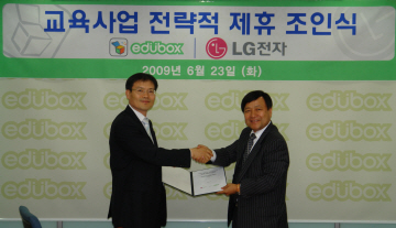 | <에듀박스는 23일 LG전자와 국가공인 영어말하기 자격시험 ESPT 활성화를 위한 전략적 제휴를 체결했다.> | ||