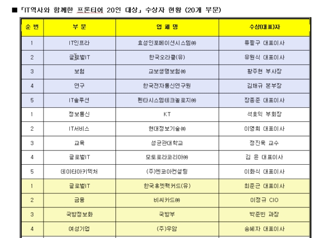 특히, 창간 20주년을 기념하여 제정된 ’IT역사와 함께 한 프론티어 20인 대상‘도 선정하여 시상한다. 20인 대상에 수상자엔 ▲류필구 효성인포메이션시스템 사장(IT인프라부분), ▲유원식 한국오라클 사장(글로벌IT부분), ▲황주현 교보생명보험 부사장(보험부분), ▲김윤 모토로라코리아 사장(글로벌IT부분), ▲석호익 KT 부회장(정보통신부분), ▲이영희 현대정보기술 사장(IT서비스부분), ▲장종준 펜타시스템테크놀로지 사장(IT솔루션부분), ▲정진욱 성균관대학교 교수(교육부분), ▲이화식 엔코아컨설팅 사장(DA부분), ▲신재철 LG CNS 사장(IT서비스부분), ▲김홍선 안철수연구소 사장(정보보안부분), ▲이정규 비씨카드 CIO(금융부분), ▲박준빈 국방부 과장(국방정보화부분), ▲최준근 한국HP 사장(글로벌IT부분), ▲송혜자 우암 사장(여성기업인부분), ▲이인복 이머니 사장(금융정보부분), ▲조종민 포시에스 사장(IT솔루션부분), ▲유시완 하나은행 본부장(금융부분), ▲김채규 한국전자통신연구원 본부장(연구부분), ▲전병현 민주당 국회의원(특별공헌부분) 등이 수상하게 된다.