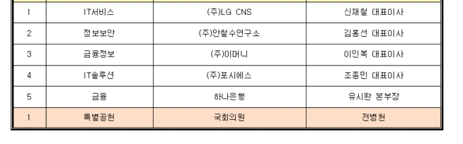 총 4개 부문에 대해 수상자를 선정하여 시상하게 될 이날 행사에서 ▲경영대상 - 김태섭 케이디씨정보통신 회장 ▲기술대상 - 김용옥 케이와이즈 사장 ▲글로벌기업 - 형원준 SAP코리아 사장 ▲지적재산권 - 김종선 KT데이타시스템 사장이 각각 수상하게 된다.