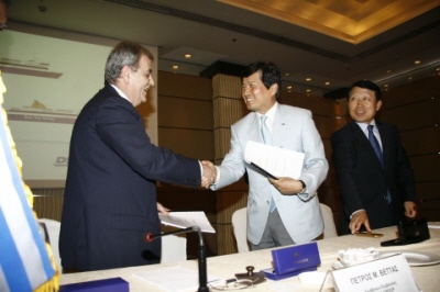 | <지난 25일 그리스 현지에서 대우조선해양 남상태 사장(오른쪽)과 아티카 그룹 페트로스 베타스 사장(왼쪽)이 계약서에 서명을 한 뒤 악수를 하고 있다.> | ||