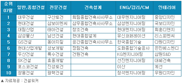 29일 건설취업포털 건설워커(www.worker.co.kr 대표 유종현)가 발표한 ‘7월 건설사 취업 인기순위’에 따르면, 대우건설은 업계 라이벌인 현대건설을 누르고 3개월째 종합건설 부문 '최고 인기 건설사' 자리에 올랐다. 대우엔지니어링(엔지니어링), 구산토건(전문건설), 희림종합건축사사무소(건축설계), 중앙디자인(인테리어) 등이 부문별 1위를 차지했다.