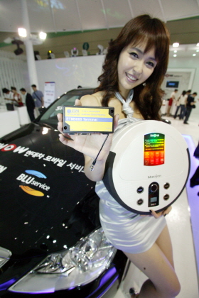 | <KT의 홍보도우미가 모바일 모듈 및 모듈이 탑재된 차량 및 로봇 청소기를 선보이고 있다. 앞으로 ‘임베디드 모바일’ 프로젝트의 진행을 통해 M2M 시장 관련 산업들이 빠르게 성장할 것으로 기대된다. > | ||