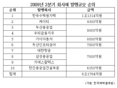 회사별 발행규모는 한국수력원자력(1조1314억원), 케이티(9300억원) 등의 순으로 많았고 발행규모 상위 10개사의 발행금액(8조1764억원)이 전체 발행금액의 17.0%를 차지했다.