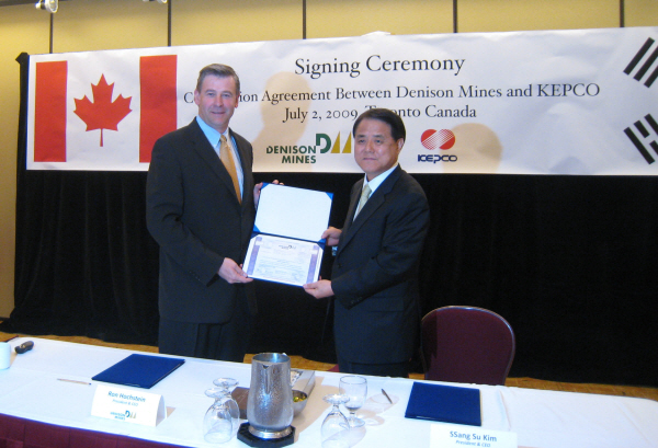 [프라임경제] 한국전력(사장 김쌍수)은 2일(캐나다 현지시간) 캐나다 터론토에서 캐나다 우라늄 전문회사인 데니슨(Denison)사와 양사간 전략적 협력협정을 체결했다.