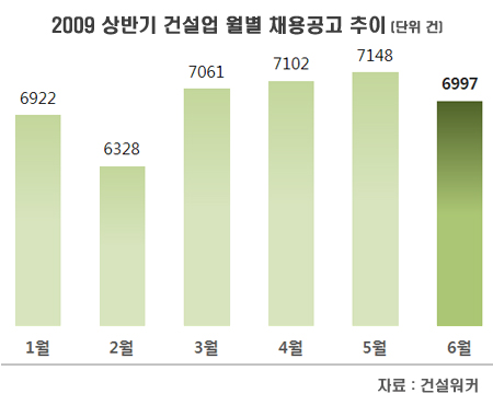 ▲ 건설사 채용은 2월을 저점으로 5월까지 3개월 연속 증가한 뒤 6월에 다소 주춤한 모습을 보였다. |