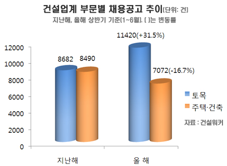 상반기 건설업계 채용공고는 전년과 비슷한 수준을 유지했으나 토목 부문은 31.5% 급증하고 주택·건축 부문은 16.7% 감소하는 등 부문별 명암이 뚜렷했던 것으로 나타났다.