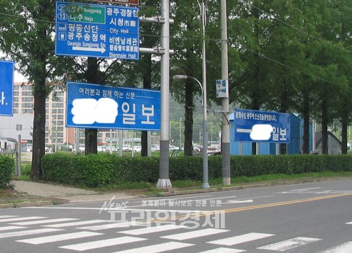8일 광주공항 인근 주민들과 K구청에 따르면 광주공항 정문 3거리 인도 가로수 앞에 지난해 G일보사의 광고성 입간판이 세워졌다. 게다가 한달여 전쯤 G일보 입간판 옆에 좀더 큰 크기로 J일보 입간판이 세워졌다. 호남지역 언론 가운데 창간 순서가 가장 오래된 신문사들이다.