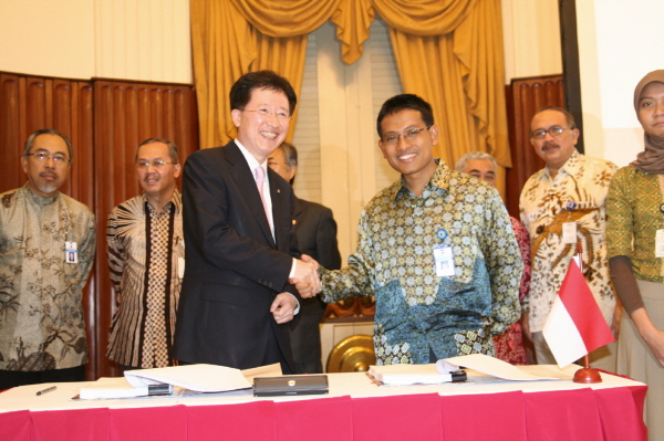 | <10일 인도네시아 자카르타시 재무부 소강당에서 열린 '인도네시아 국가재정정보시스템 구축 사업 계약 체결식'에서 LG CNS 공공1사업부장 조기현 상무(사진 왼쪽)와 수다르또 인도네시아 재무부 사업팀장(사진 오른쪽) 계약서 서명 후 악수를 나누고 있다. > | ||
