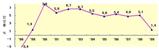 노동부 자료, 연도별 6월말 협약임금인상률 추이 |