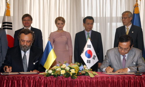 <사진=김동수 수출입은행장(오른쪽)과 미콜라 우도비첸코 우크라이나 수출입은행 수석부행장이 총리실에서 한승수 총리와 율리아 티모센코 우크라이나 총리가 임석한 가운데 업무협약서에 서명하고 있다.>