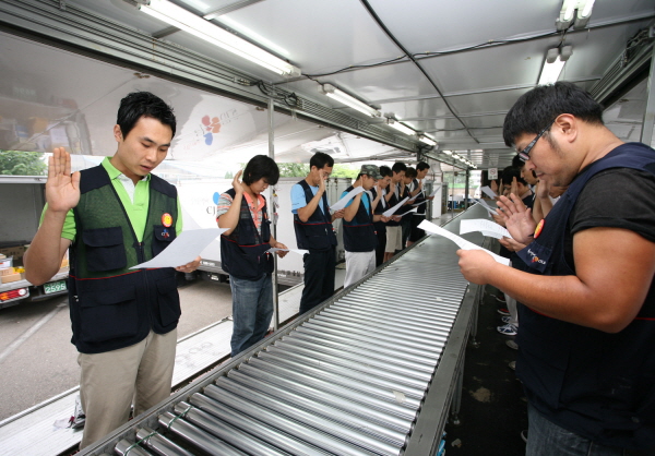 택배 친절 선서식에서 항상 미소로 고객을 대하고, 밝은 목소리로 전화를 받으며, 예의 바른 자세로 택배업무에 임하겠다고 선서를 했다.
