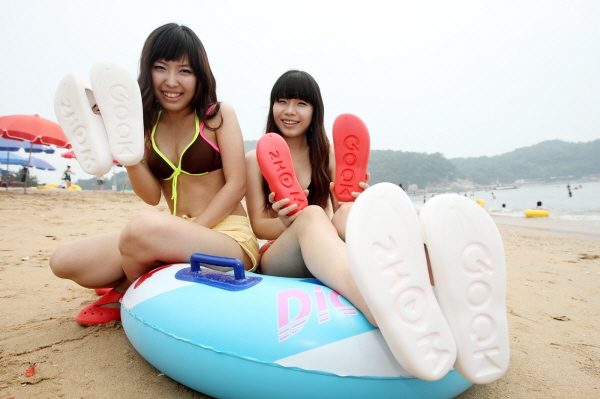 | <을왕리 해수욕장을 찾은 대학생들이 QOOK과 SHOW가 새겨진 비치슬리퍼를 선보이고 있다.> | ||