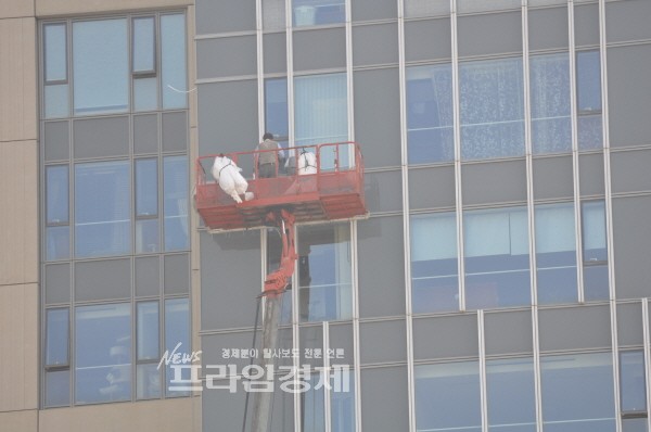| 외부 유리벽 실리콘 공사를 하고 있는 모습. 피해 입주민들은 이 같은 공사가 예전부터 있었지만 누수현상은 막을 수 없었다고 전했다. |