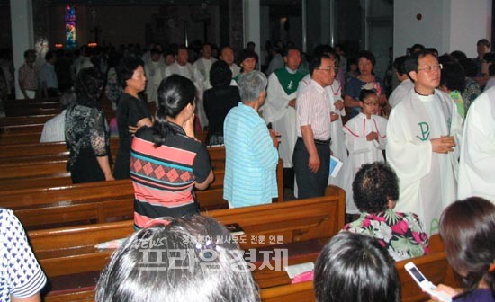 [프라임경제]천주교 광주대교구(대주교 최창무) 임동성당의 27일 오전 미사도중 신도들이 회계비리를 둘러싼 의혹에 대해 거세게 항의하는 가운데 최창무 대주교와 신부들이 퇴장하고 있다.