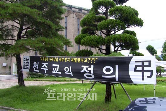 이들이 ‘근조 천주교 정의’, ‘천주교 신자임을 부끄럽게 만들지 말라’ 등의 현수막을 내걸었다. 특히 ‘도둑 잡은 신부님을 처벌하는 것은 나도 … 고백하는 것이다’는 등의 글귀는 이들의 절박함을 대변하고 있다.