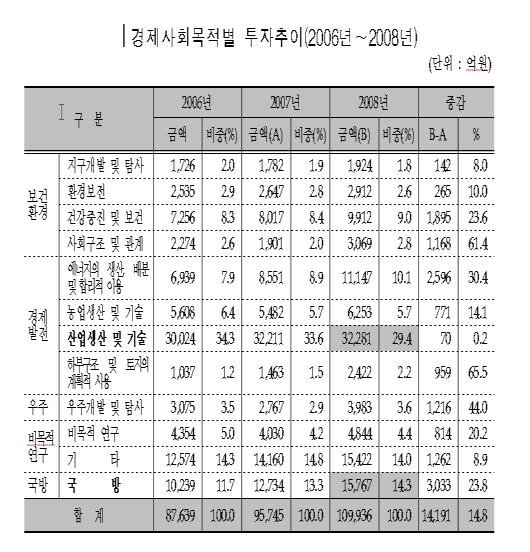 [프라임경제]교육과학기술부가 29개 부처청에서 수행한 486개 사업, 37,449개 과제를 대상으로 조사 분석한 결과, 2008년 집행된 총 국가연구개발사업 투자액은 10조 9,936억원으로 전년대비 14.8% 증가한 것으로 나타났다. 부처별로는 지식경제부가 3조 5,927억원으로 가장 많고, 교육과학기술부(3조 4,970억원), 방위사업청(1조 4,322억원) 등 순위로 나타났다.