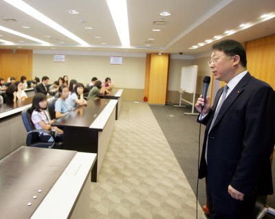 | <SK텔레콤 박태진 IR담당임원은 29일 오전 11시 SK텔레콤 을지로 본사에서 청소년 50여명을 대상으로 'SK텔레콤과 함께하는 행복직업체험'의 첫번째 강연을 펼쳤다.> |