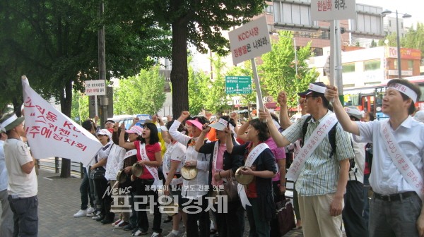 | <KCC건설 앞에서 시위를 벌이고 있는 입주예정자들.> | ||