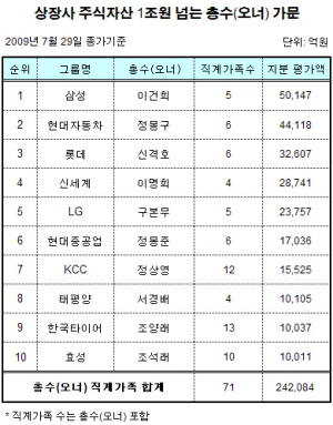 30일 재벌닷컴이 재계 총수 및 직계가족이 보유한 상장사 주식지분 가치를 전 날인 29일 종가 기준으로 평가한 결과 1조원을 넘은 ‘주식갑부’ 가문은 10곳으로 집계됐다.