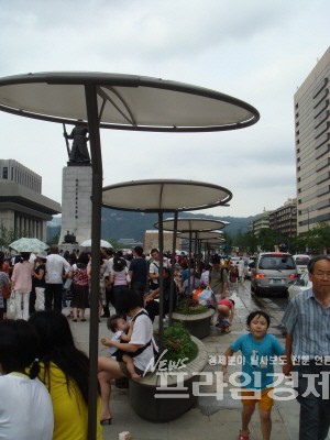 이명현(서울·37) 씨는 “광화문광장은 햇빛이 쨍쨍한 도로의 한 가운데 있어 아스팔트에선 뜨거운 열기가, 하늘에선 맹렬한 햇볕이 내리쬐는데 차양막은 정말 쓸모가 없다”며 “차라리 나무 그늘이 있으면 훨씬 시원하고 휴식공간으로 잘 활용될 것 같다”고 말했다.