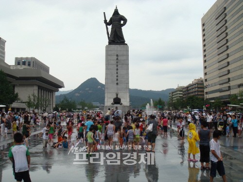 | < 사진 = 지난 1일 개장한 광화문광장 이순신 동상 앞 분수에서 아이들이 물놀이를 즐기고 있는 모습. 6일까지 84만명의 인파가 몰려들었다 > | ||