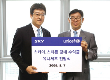 | < 팬택계열은 7일 서울 상암동 팬택 빌딩에서 팬택계열 국내마케팅본부장 이용준 상무와 한국 유니세프 이강호 부장이 참석한 가운데 스카이 스타폰 경매 수익금 전달식을 가졌다.> | ||