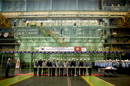 | <사진설명=두산엔진 이성희 사장(왼쪽 일곱번째)과 선주사, 기술사 및 관계자 일행이 저속엔진 6000만마력 돌파를 기념해 엔진기동을 위한 스타트 버튼을 누르고 있다.> | ||