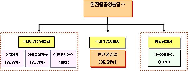 한편 한진중공업홀딩스는 국내 상장 자회사인 한진중공업의 36.54% 지분을 소유하고 있고, 비상장 국내 자회사로 한일레저(99.99%), 한국종합기술(95.31%), 한진도시가스(100%)와 해외 자회사 HACOR.Inc(100%) 등을 소유, 수직구조 형태로 이뤄져 있다.