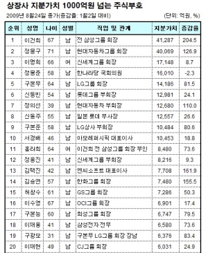 한편, 이재용 삼성전자 전무는 6580억원으로 18위를 기록, 가족 세 명이 20위권 순위 안에 진입하기도 했다.