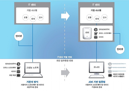 LG CNS가 현재 추진하고 있는 '서버 기반 컴퓨팅'은 기존 IT 환경과는 근본적으로 다른 설계를 통해 기업 IT시스템이 구축된다. 현재 IT 패러다임은 개인 PC에 소프트웨어를 설치한 후 이를 직접 실행, 업무를 진행하게 되며 각 데이터들은 모두 개인 PC에 저장되어 관리가 된다. '서버 기반 컴퓨팅'이 구축되면 임직원들은 개인 PC로는 단순히 부팅만 한 후 네트워크를 통해 서버로 들어가 모든 업무를 진행하게 된다. 이 때 임직원이 필요로 하는 소프트웨어는 회사 서버에 모두 설치가 되어 있으며 각 개인이 업무를 통해 만든 데이터는 개인에게 할당된 회사 데이터 저장 장비에 모두 저장되게 된다.